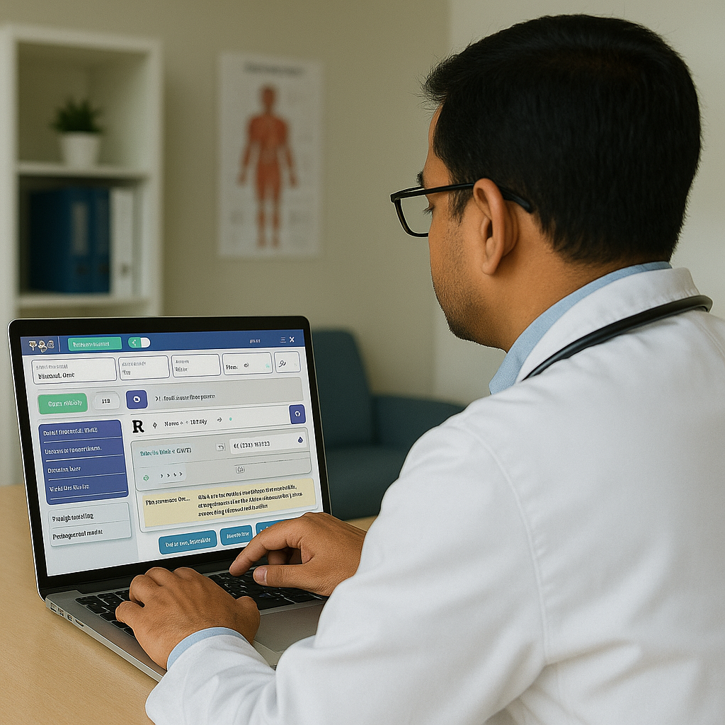 Custom-built clinical and administrative software including EMR/EHR systems, hospital information systems, pharmacy management, and diagnostic workflow solutions.